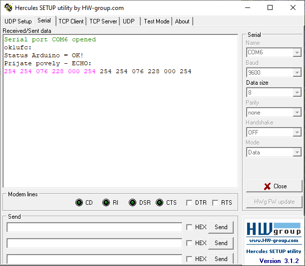 tentýž bajt odešle. Vyvedení mého testovacího programu je na