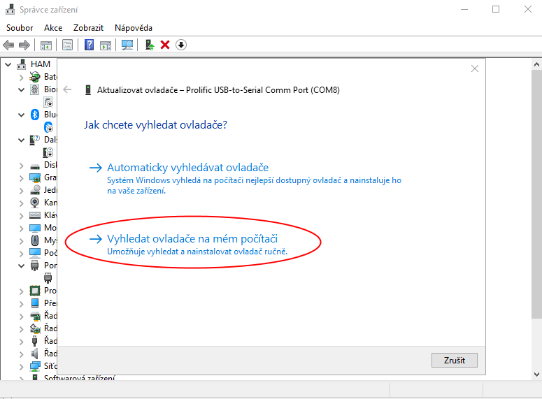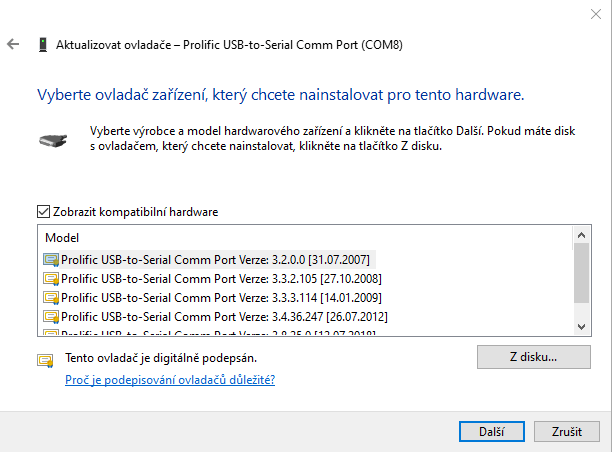 3. Použít ovladač Prolific vhodné verze, v tomto případě verze 3.2.0.0