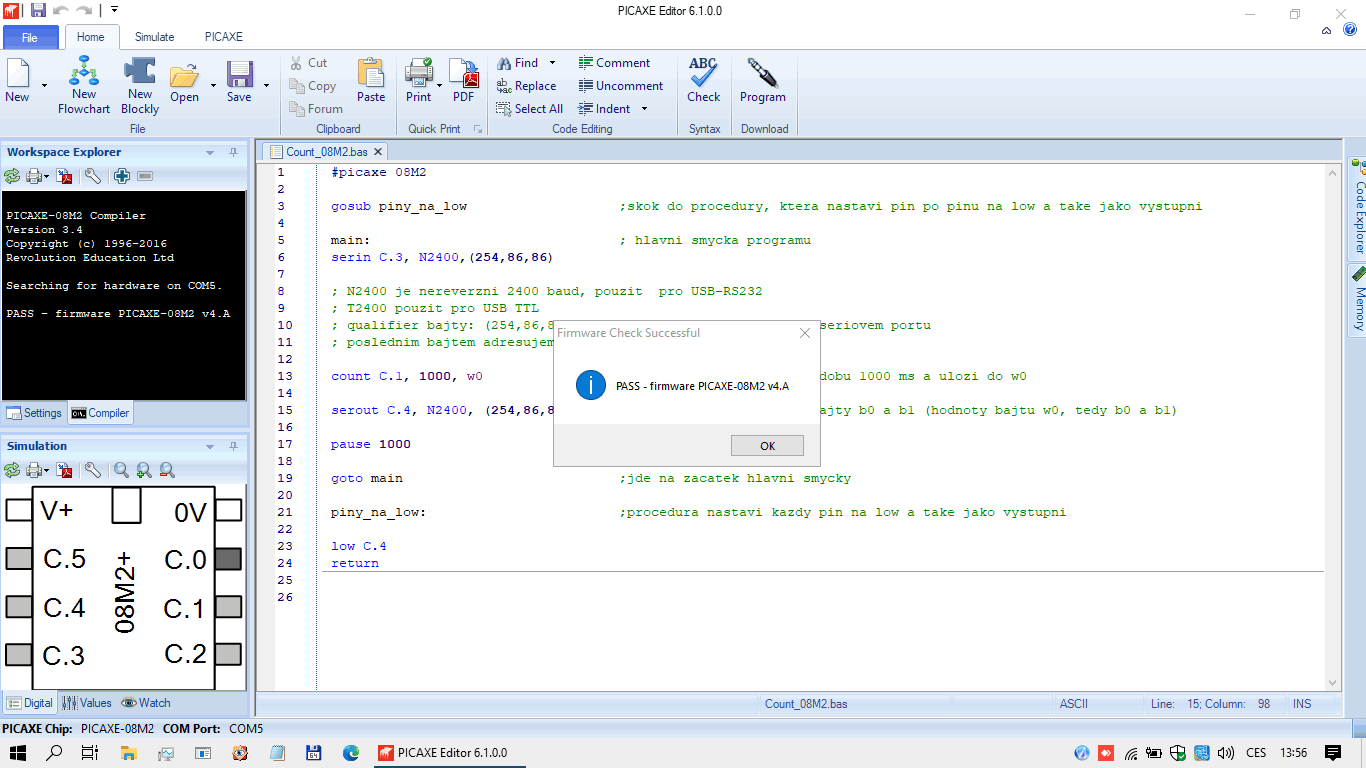 PICAXE, a to přes USB FTDI převodník. Vpravo je připojen TCVR Icom, tj.