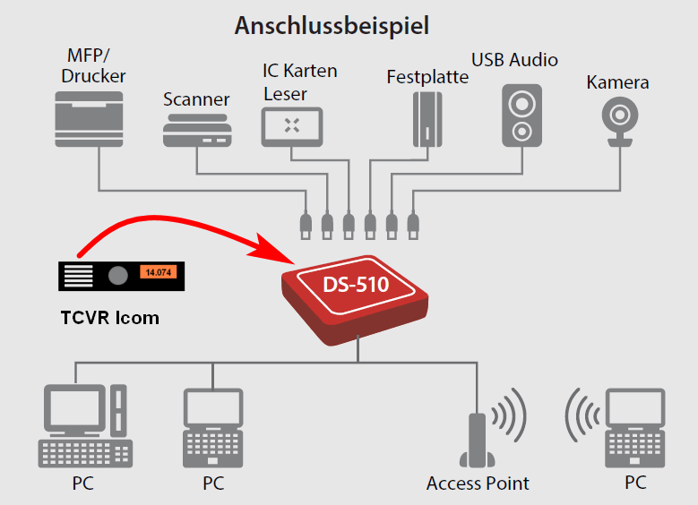 Icom kabelem typu USB (A) - USB (B) k zařízení DS-510 jsem znázornil do