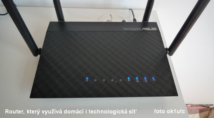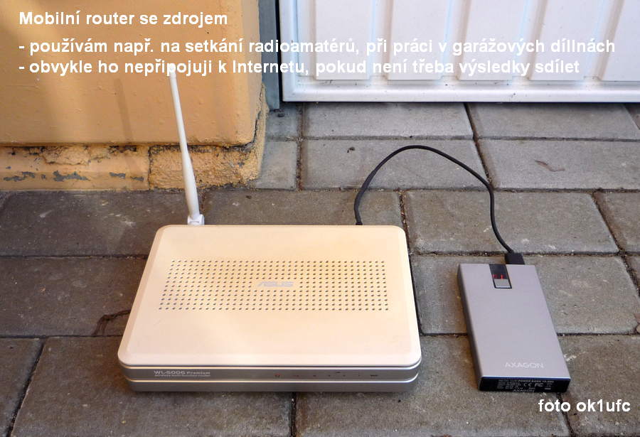 Občas potřebuji síť svým dosahem prodloužit. Nebo zrealizovat síť např. na setkání radioamatérů, v restauraci, na dovolené, na vandru, na zahradě nebo před garáží. Od toho mám stařičký router Asus 500, který je napájený z powerbanky. Opravdu všechny přístroje té nejjednodušší sítě vidíte na betonu u garáže. Nic víc není třeba. Jen ty notebooky, kterými něco ovládáte (měříte) nebo na kterých běží server. Nebo alespoň ten tablet či mobil a samozřejmě přístroje (přepínače, tunery, měřáky).