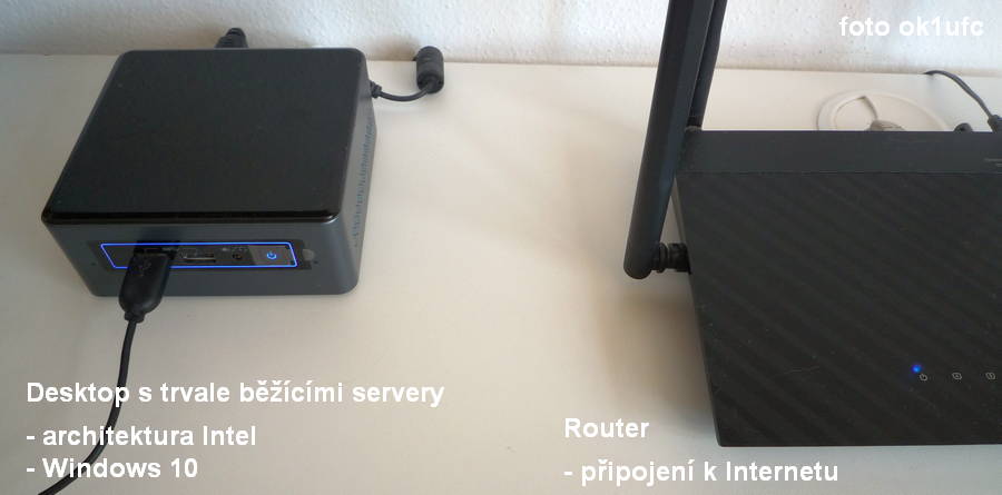 Až si jednou opět koupím veřejnou IP, tak právě tento server bude připojen k Internetu. Server vypadá takto - viz obrázek dole. Kdysi na jeho místě byl jednodeskový SBC Asus (obdoba Raspberry Pi3). Asi před rokem jsem ho nahradil nehlučným Intel NUC s SSD diskem, 8G RAM. Intel má spotřebu srovnatelnou s původním SBC a jeho HDD. Intel jede spolehlivě, nepřetržitě: