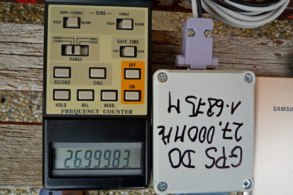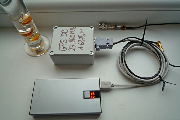 Na co si dávám od zkoušek GPS DO pozor? 1. Fázový závěs s obvodem 4046 lze zavěsit na nízké kmitočty. Například oscilátor 27 000 000 Hz lze binární děličkou 4060 dělit poměrem 16 384 a získat kmitočet po vydělení f=1 647,94921875 Hz. U GPS U-blox lze nastavovat kmitočet s rozlišením jeden Hz. Nastavíme f=1648 Hz. Fázový závěs bude oscilátor stabilizovat na kmitočtu nepatrně vyšším, ale bude fungovat. Vyzkoušel jsem i kmitočet 27MHz/4096, tj. 6592 Hz. Fázový závěs se zavěšoval dobře. 2. Co nebude fungovat, je použití koaxiálního kabelu pro přivedení