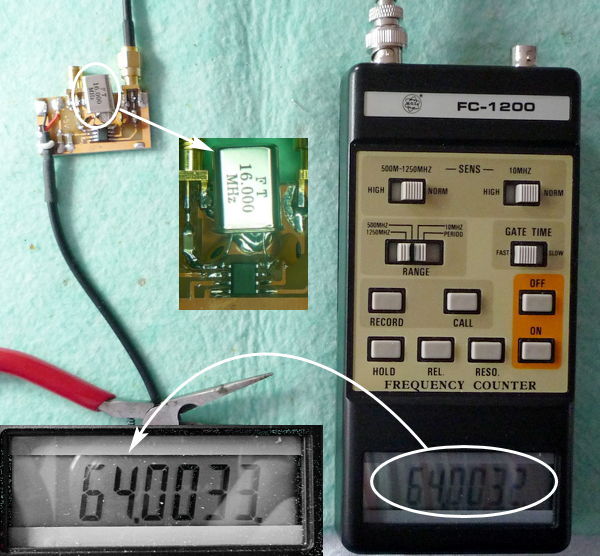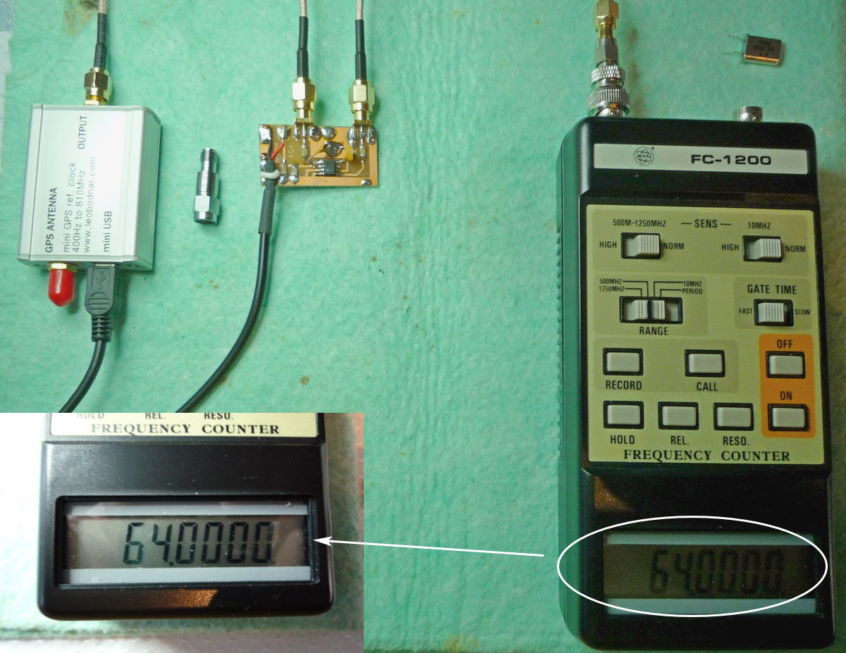 Pokud ICS 501 nepoužíváme ve funkci oscilátoru, ale jen jako PPL násobič, je pro správnou funkci násobiče důležitá úroveň vstupního signálu. Ta nesmí být malá. Základní test jsem provedl s generátorem Leo Bodnar, je mezi českými hamy rozšířený. Vstupní kmitočet byl 16 MHz, na výstupu jsem očekával 64 MHz. Na generátoru Leo Bodnar byla nastavena nejnižší úroveň. Násobič fungoval tak, jak měl a na výstupu jsem obdržel signál 64 MHz, samozřejmě s úrovní kolem 0 dBm. Frekvence signálu byla měřitelná kapesním čítačem: