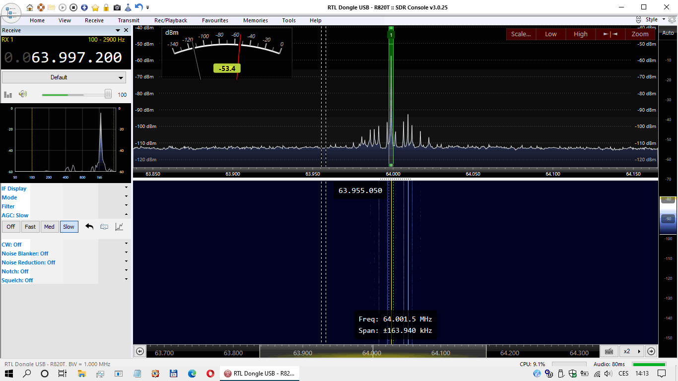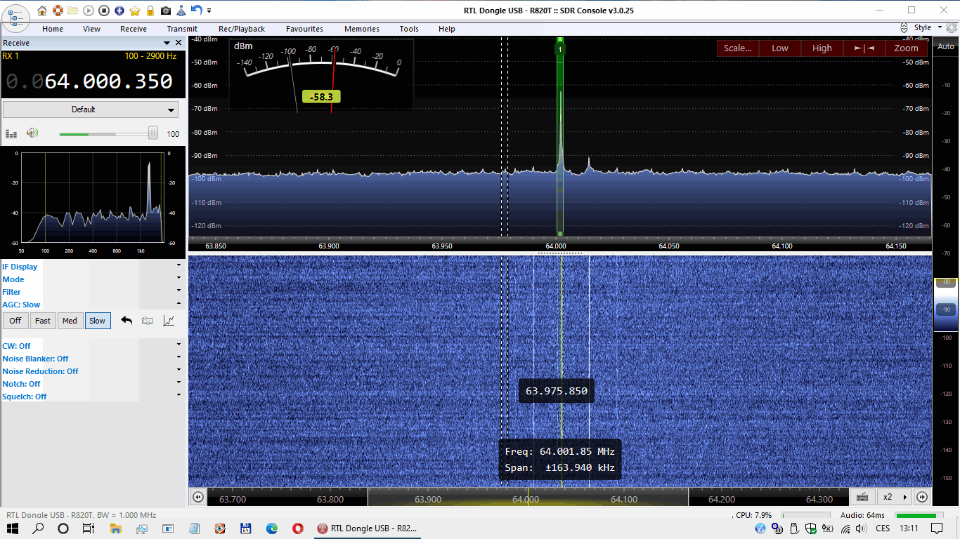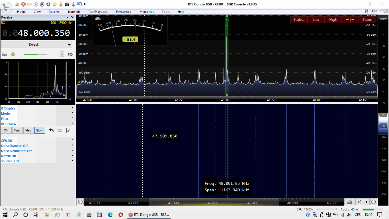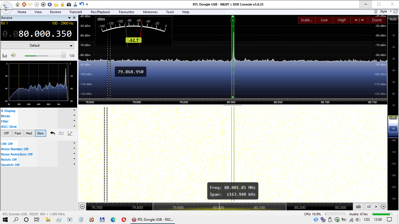 Spektrum jsem pro ilustraci zachytil levnou klíčenkou USB RTL SDR. Důvod je ryze amatérský. Levnou klíčenku si pořídil a  vyzkoušel pravděpodobně každý, nicméně, je užitečná, ale může být i zavádějící. Užitečná je v tom, že leží u notebooku při ruce a lze s ní najít spektrální čáry oscilátoru a poslechnout si uchem signál.