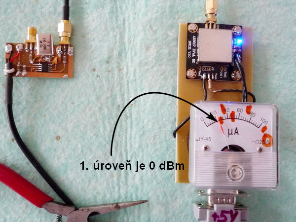 K měření použil jednoduchý indikátor úrovní  popsaný zde. Při správné funkci oscilátoru a násobiče přístroj ukazuje úroveň kolem 0 dBm.