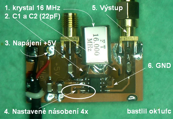 Použil jsem dříve vyrobenou desku násobiče. Deska nebyla určena pro osazení krystalu a nezbytných kondenzátorů oscilátoru C1 a C2. Prostě jsem s takovým použitím při návrhu desky nepočítal. Ke zkoušce jsem použil krystal 16 MHz, který jsem připájel přímo na nožičky integrovaného obvodu a dva diskové vývodové kondenzátory, každý o kapacitě 22 pF.