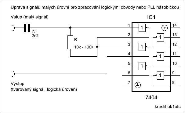 6. Osvědčila se mi úprava vstupní úrovně malých signálů pomocí logických invertorů 74HC04, použita dvě hradla za sebou, první hradlo má "zpětnovazební" rezistor (R=10 kOhm) mezi výstupem a vstupem (tj. mezi špičkami 2 a 1 nebo 6 a 5, 10 a 11, ...). Druhé hradlo je bez rezistoru.