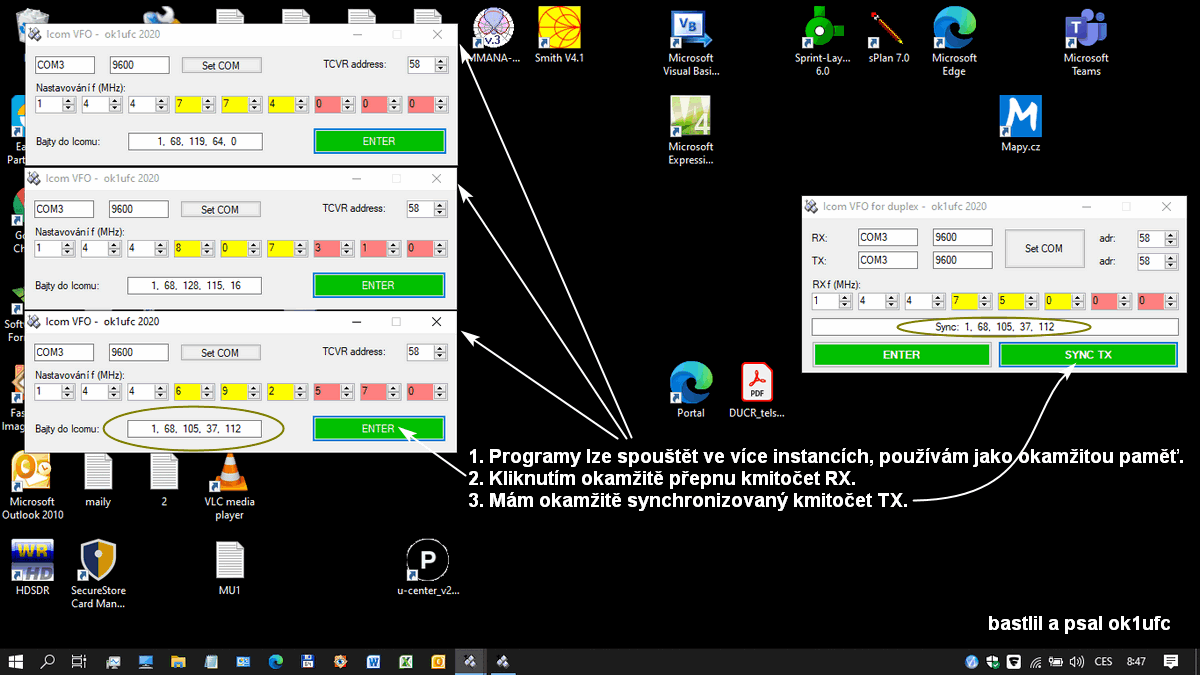 rychlé. Jak s tím dělám? Programy lze spouštět ve více instancích. Proto občas používám program pro nastavování kmitočtu jako provozní paměť - jedním kliknutím rychle přepnu kmitočet RX na požadovanou stanici. Na snímku obrazovky jsou spuštěné tři instance: