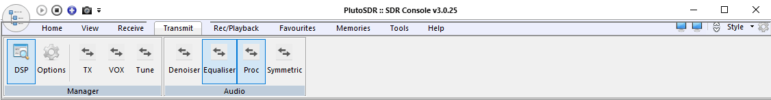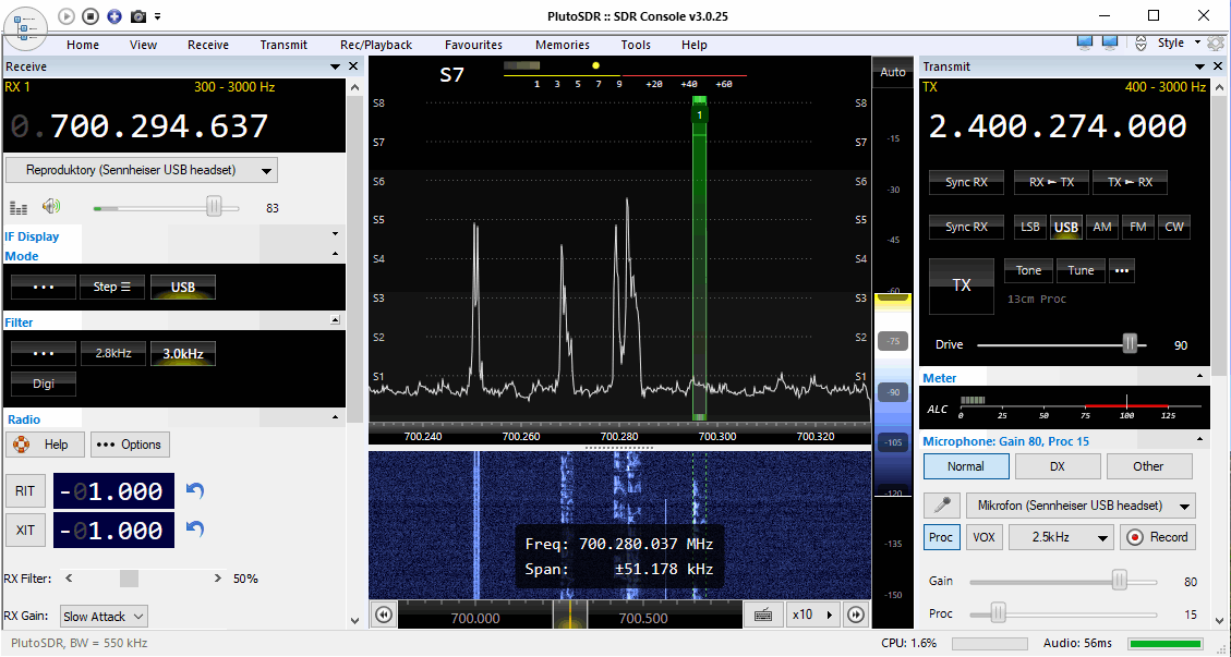 1. Základní nastavení TX Pluta SDR je: DRIVE = 90, Gain = 80, Proc =