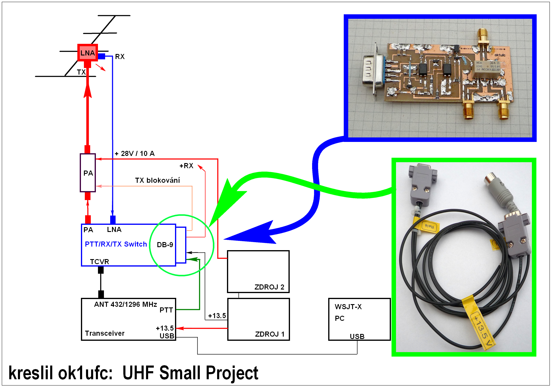 UHF Small Project je další generací sady (stavebnice) maličkých zařízení pro pásma 432 MHz a 1296 MHz. Základ stanice tvoří PC s programem WSJT-X a časovou synchronizací, VHF/UHF transceiver, PTT/RX/TX přepínač (popis zde), dva napájecí zdroje +13.5 V, výkonový polovodičový zesilovač, blok LNA s anténním relé a propojovací kabely.