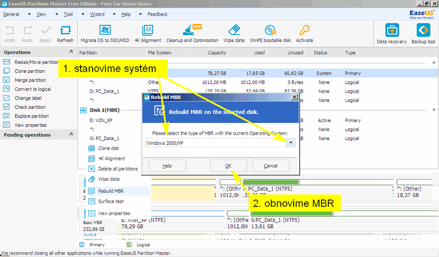 disku, kliknu na MBR, dám příkaz obnovit MBR (je třeba vybrat správně