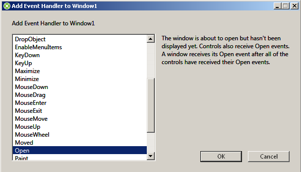 Na obrázku nahoře je okno Event Handler pro Window1.