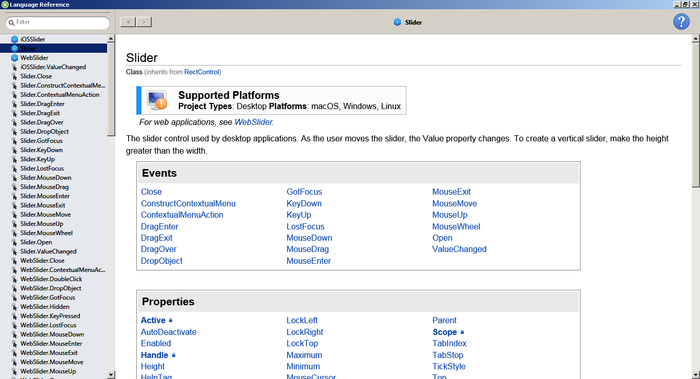 seznamem a odkazy na události (events), vlastnosti (properties),