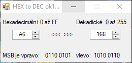 Zastavím se u dovednosti v přepočtu dekadických hodnot na bajty. Ani já ji nemám a používám jednoduchý program z dob, kdy jsem se učil programovat - vpravo. Ten funguje na notebooku, i když nejde ve vlaku Internet. Vidíte, že dekadické hodnotě 166 odpovídá hexadekadická A6.