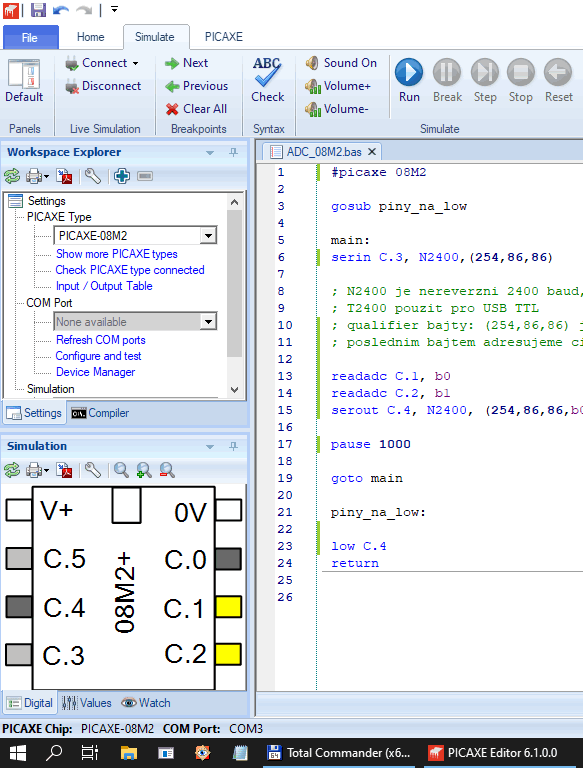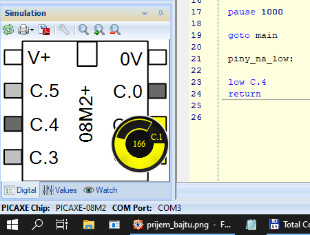 Ve vláčku lze program vyzkoušet na simulátoru, který je součástí vývojového prostředí PICAXE Editor 6. Vlevo dole na obrazovce jsou špičky (piny) čipu. Když klikneme pravým tlačítkem na vstupy ADC, zobrazí se nám "potenciometr", kterým nastavíme napětí na vstupu a hodnota je ukazovaná jako dekádické číslo 0-255 - vpravo. Nastavil jsem si na špičkách C.1 a C.2 hodnoty 166 a 167, abych si je poznal.