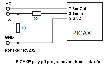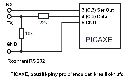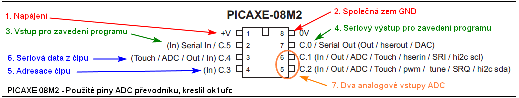 1. Čip PICAXE 08 M2 převádí pomocé instrukce readadc hodnotu napětí na pinu ADC na číslo. Hodnota musí být v rozmezí od 0V do + Vcc (napájecí napětí čipu na špičce 1, označené též +V).