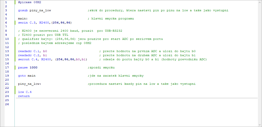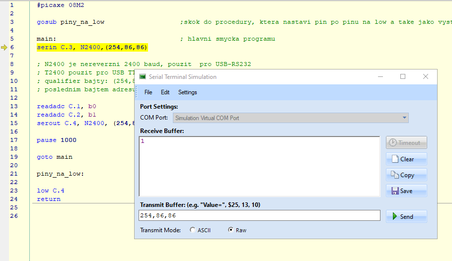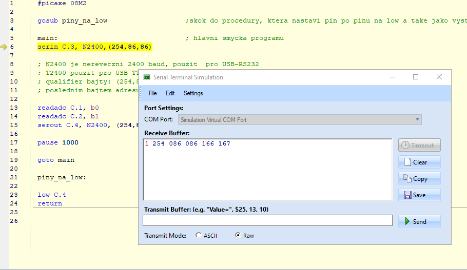 Program se rozběhne. Nejdřív vykoná skok do procedury "piny_na_low". V této pproceduře se nastaví pin C.3 na low a též, jako výstupní. Potom se program dostane k hlavní smyčce (řádek 5, návěští main:) a začne se vykonávat. To znamená, že se zastaví na řádku číslo 6 a začne vyčkávat, až přijde po sériovém portu sekvence tří bajtů, v mém případě 254,086,086.